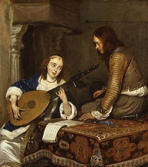 A Woman Playing the Theorbo Lute and a Cavalier ca 1658