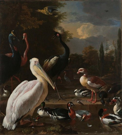 A Pelican and other Birds near a Pool