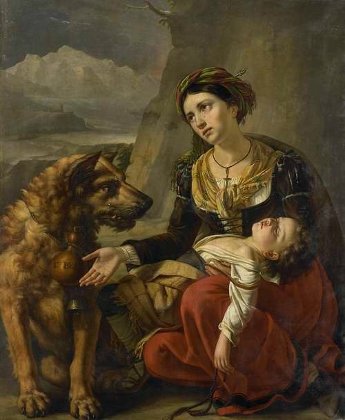 A Saint Bernard dog is a stray woman with a sick child to help. 1827
