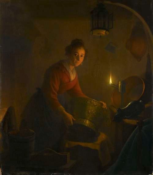 A woman in a kitchen by candlelight