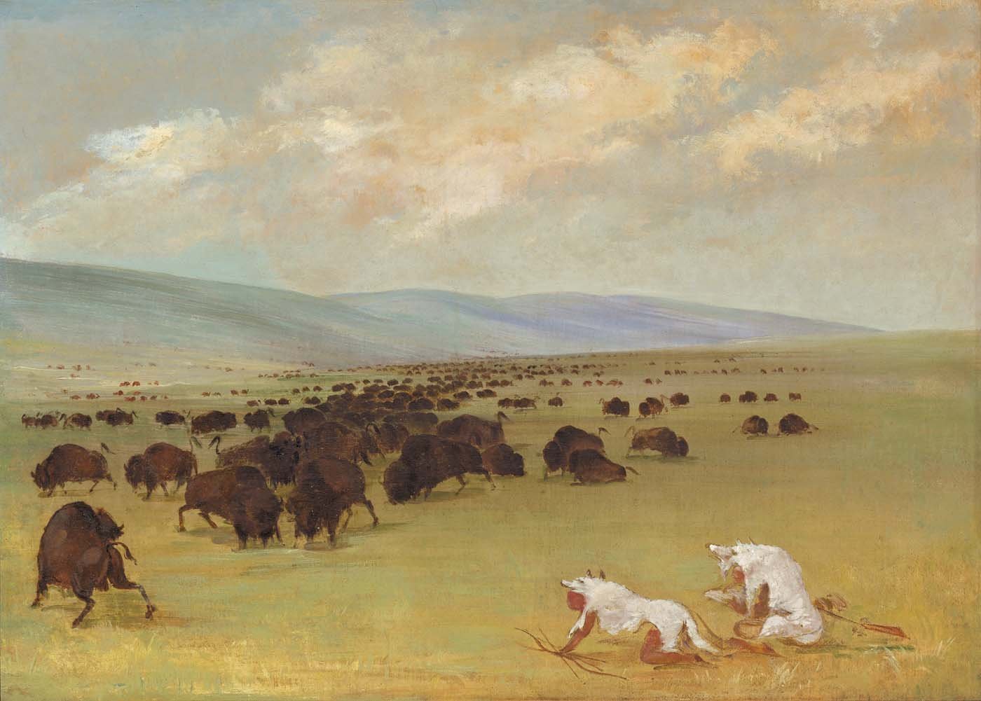 Catlin and His Indian Guide Approaching Buffalo under White Wolf Skins