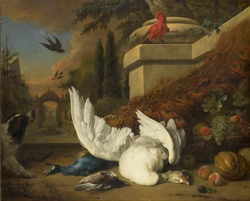 A dog with a dead goose and a peacock. ca. 1700